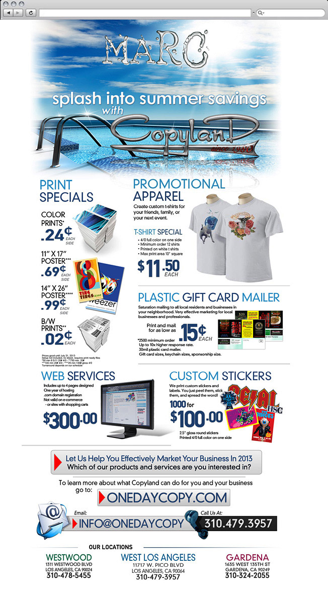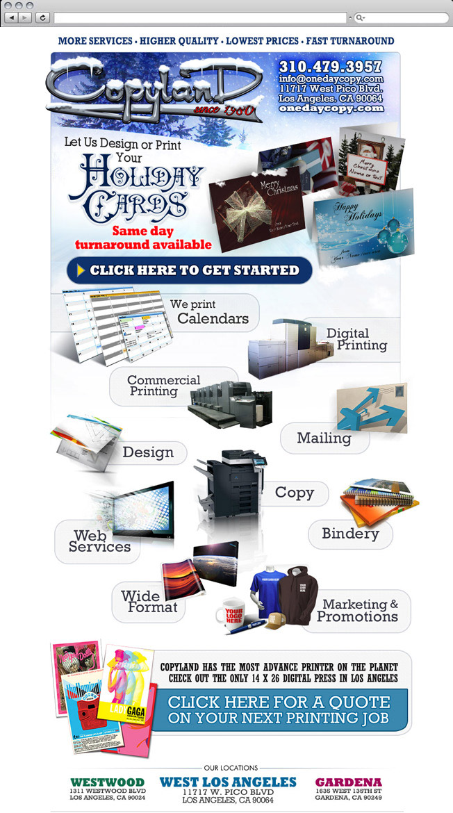Marketing mailers created for Copyland. A full service print shop located in West Los Angeles